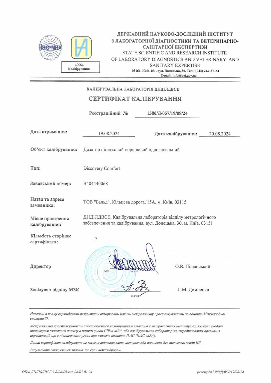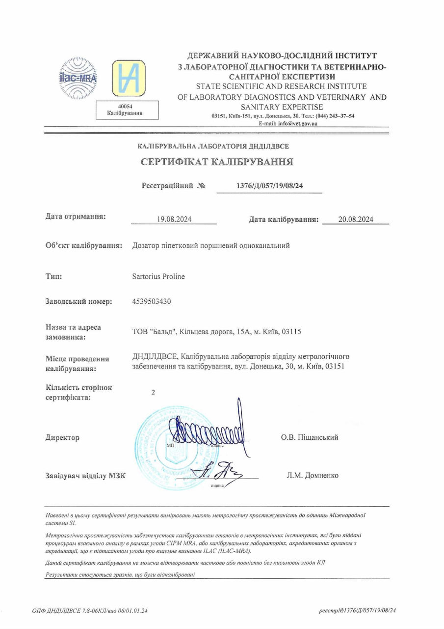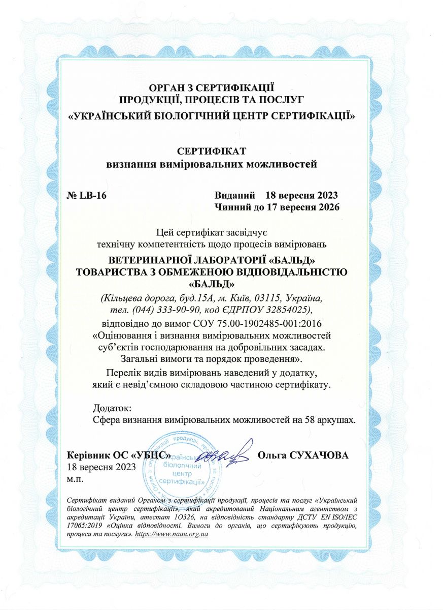 Усі аналізи виконуються виключно на приладах та устаткуванні, які пройшли метрологічну перевірку та відповідають усім вимогам та критеріям діагностичної лабораторії. Рекомендуємо господарям тварин вимагати сертифікаційні документи ветеринарної лабораторії, в яку здаєте аналізи своєї тварини, оскільки не всі лабораторії проходять належну сертифікацію!