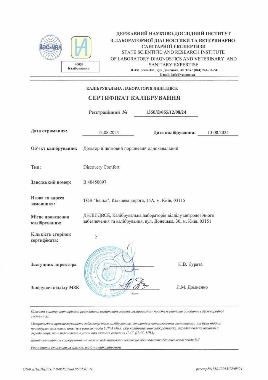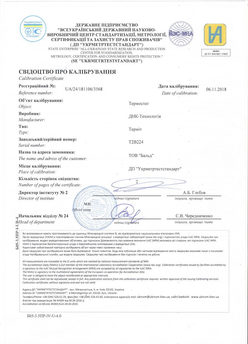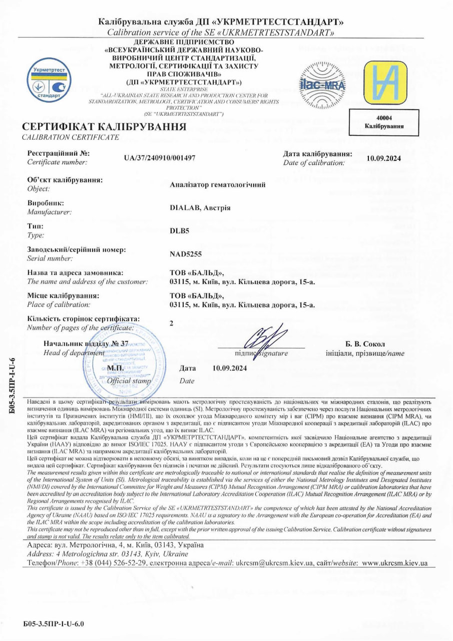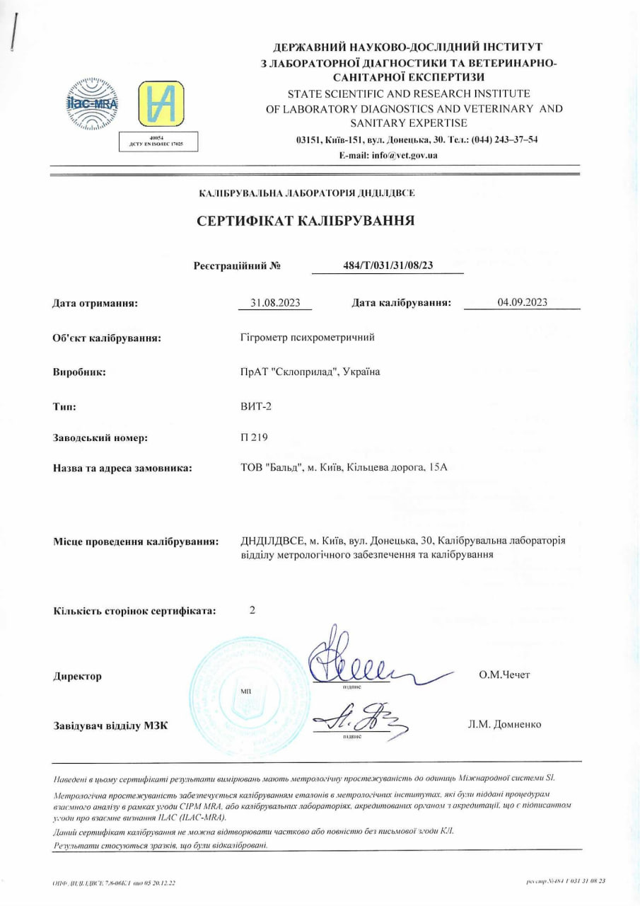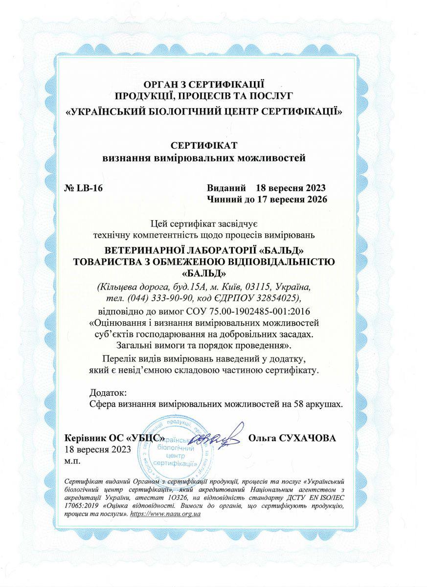 Сертифікат визнання вимірювальних та технологічних можливостей, дозвіл СЕС, метрологічна перевірка обладнання та інше Лабораторію "Бальд" сертифіковано за всіма критеріями відповідно до вимог та норм законодавства України.